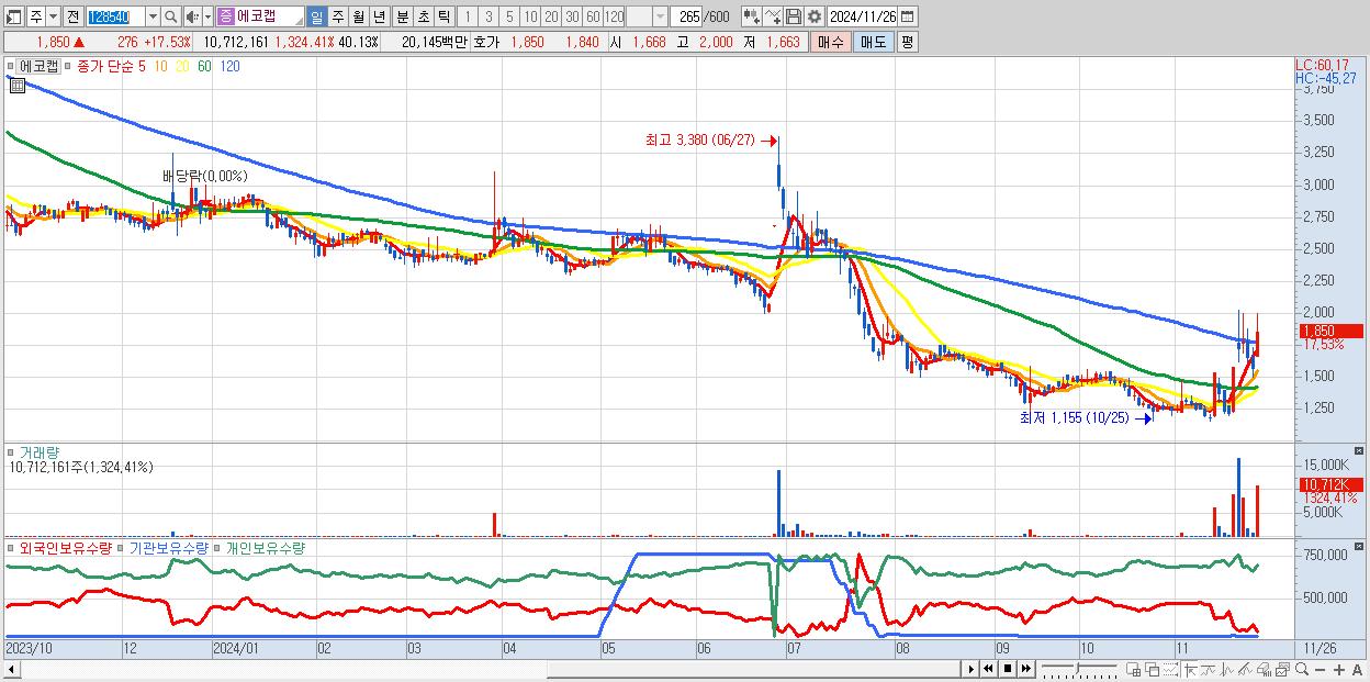 - 에코캡 (1,850원 ▲ 17.53% , 시총: 494억, 거래량: 10,712,161, 거래대금:201억)