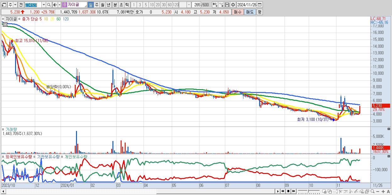 - 자이글 (5,230원 ▲ 29.78% , 시총: 708억, 거래량: 1,443,709, 거래대금:71억)