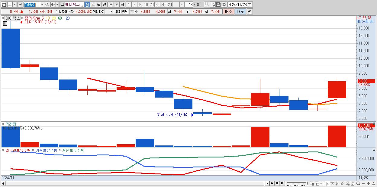 - 에이럭스 (8,990원 ▲ 25.38% , 시총: 1,200억, 거래량: 10,429,842, 거래대금:908억)