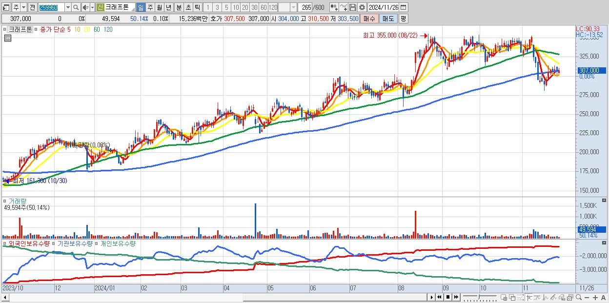 - 크래프톤 (307,000원 0% , 시총: 147,055억, 외국인 순매수 거래금:36억)
