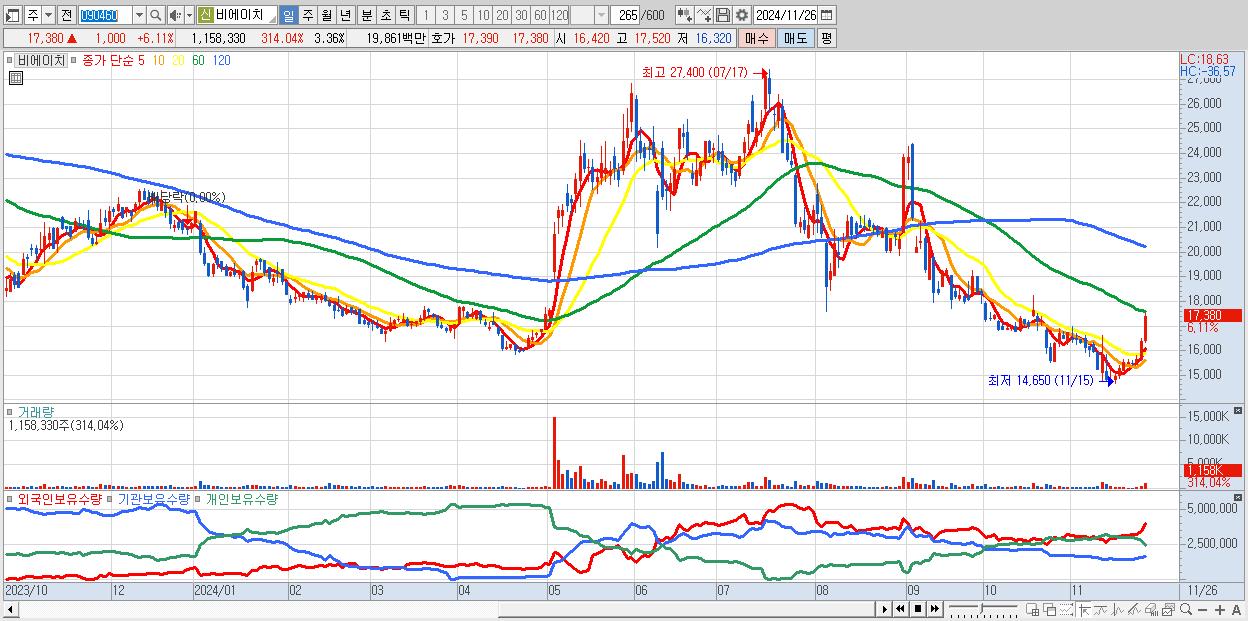 - 비에이치 (17,380원 ▲ 6.11% , 시총: 5,990억, 외국인 순매수 거래금:49억)