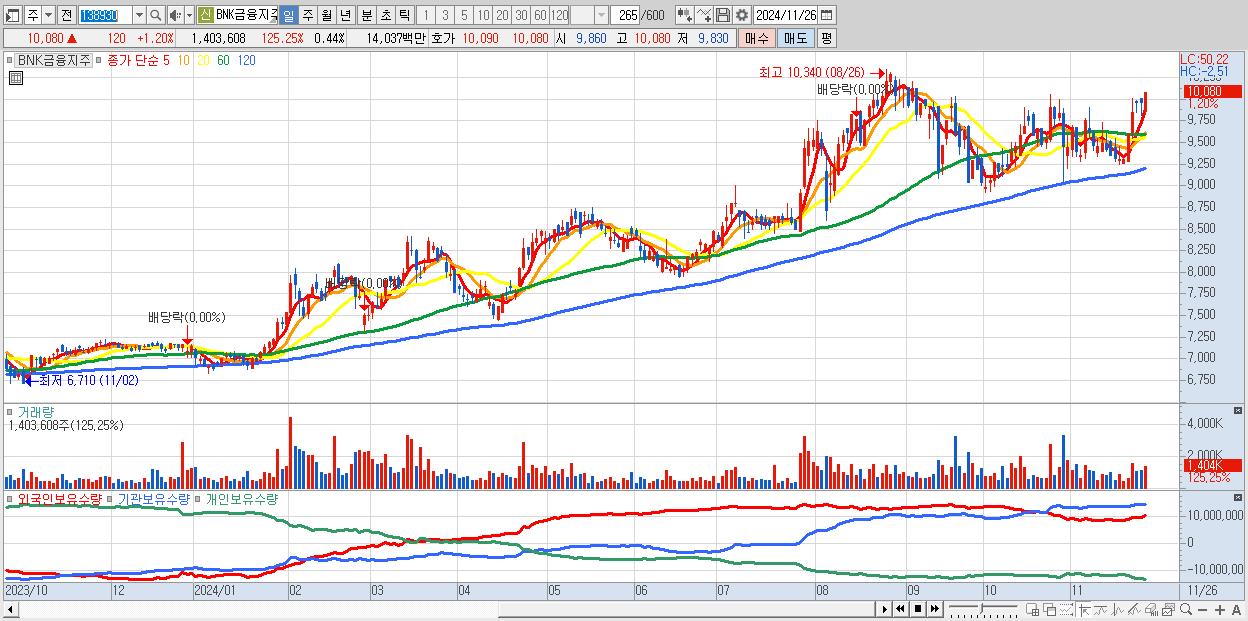 - BNK금융지주 (10,080원 ▲ 1.2% , 시총: 32,300억, 외국인 순매수 거래금:59억)