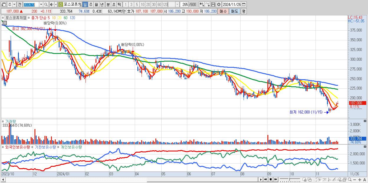 - 포스코퓨처엠 (187,000원 ▲ 0.11% , 시총: 144,856억, 외국인 순매수 거래금:44억)