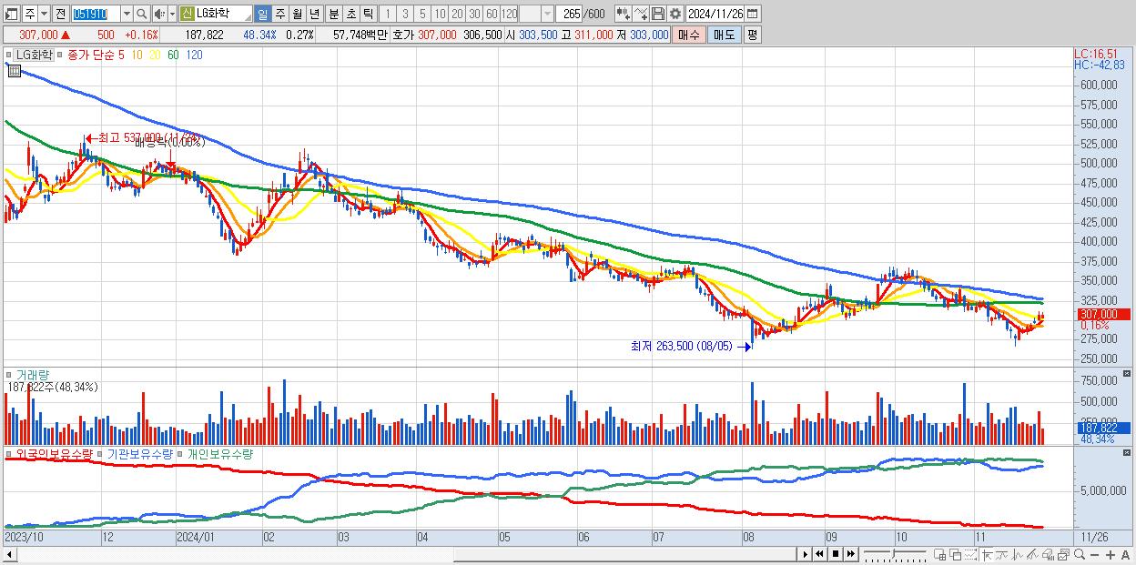 - LG화학 (307,000원 ▲ 0.16% , 시총: 216,718억, 외국인 순매수 거래금:39억)