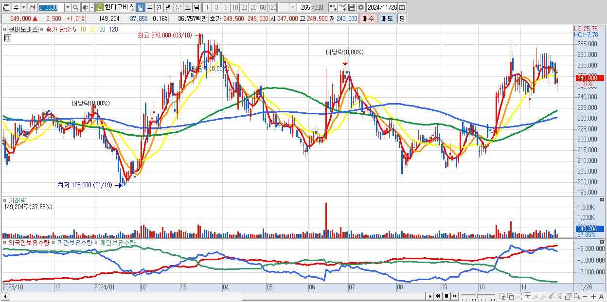 - 현대모비스 (249,000원 ▲ 1.01% , 시총: 231,558억, 외국인 순매수 거래금:60억)