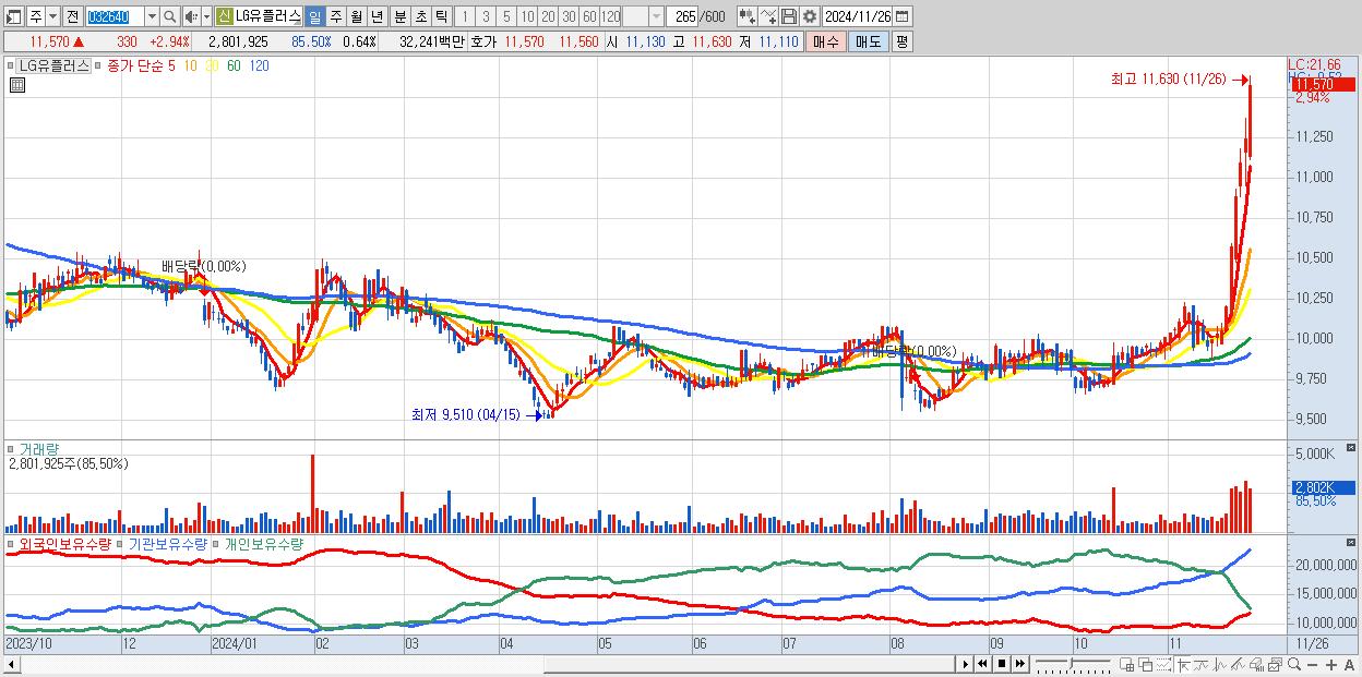 - LG유플러스 (11,570원 ▲ 2.94% , 시총: 50,516억, 외국인 순매수 거래금:56억)