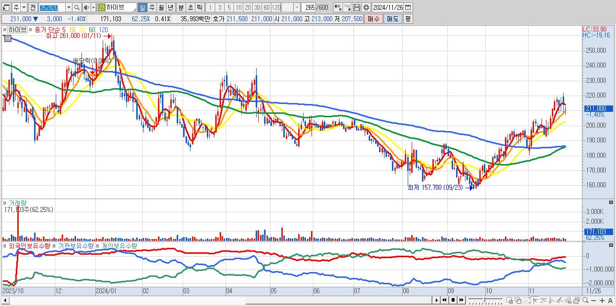 - 하이브 (211,000원 ▼ -1.4% , 시총: 87,886억, 외국인 순매수 거래금:62억)