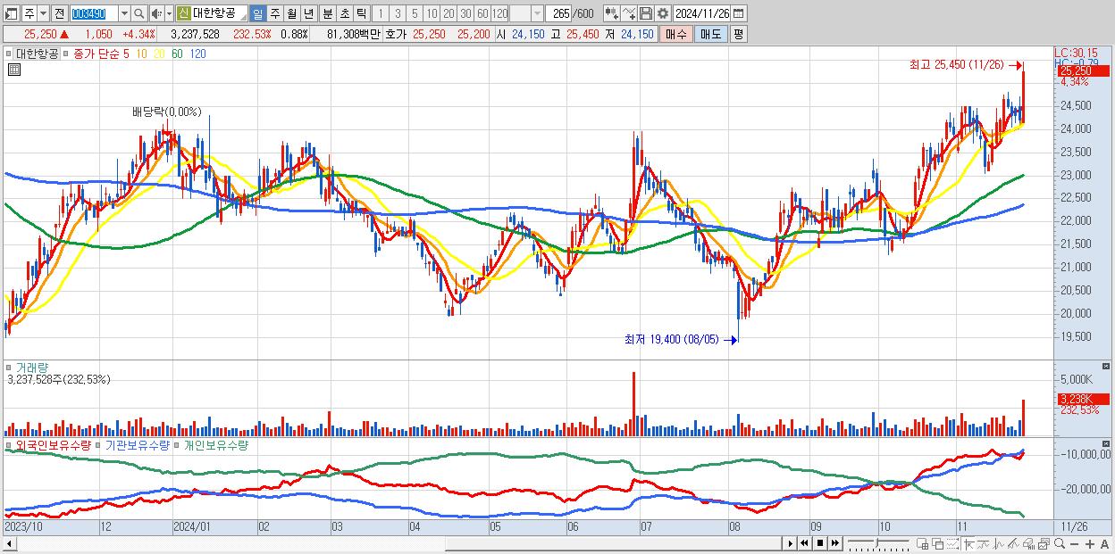 - 대한항공 (25,250원 ▲ 4.34% , 시총: 92,976억, 외국인 순매수 거래금:130억)