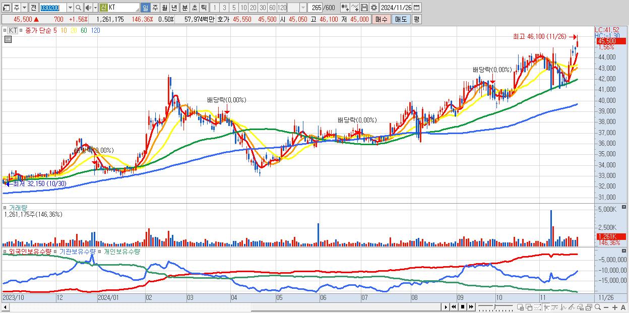 - KT (45,500원 ▲ 1.56% , 시총: 114,670억, 외국인 순매수 거래금:31억)