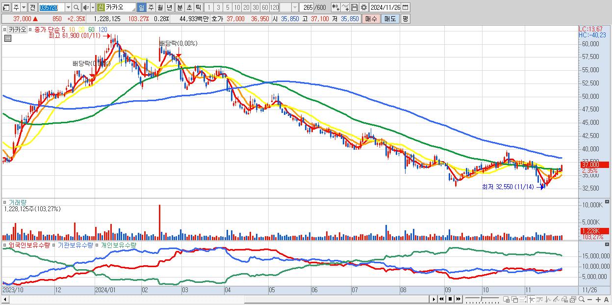 - 카카오 (37,000원 ▲ 2.35% , 시총: 164,114억, 외국인 순매수 거래금:70억)
