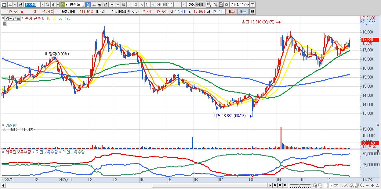 - 강원랜드 (17,580원 ▲ 1.8% , 시총: 37,611억, 외국인 순매수 거래금:36억)
