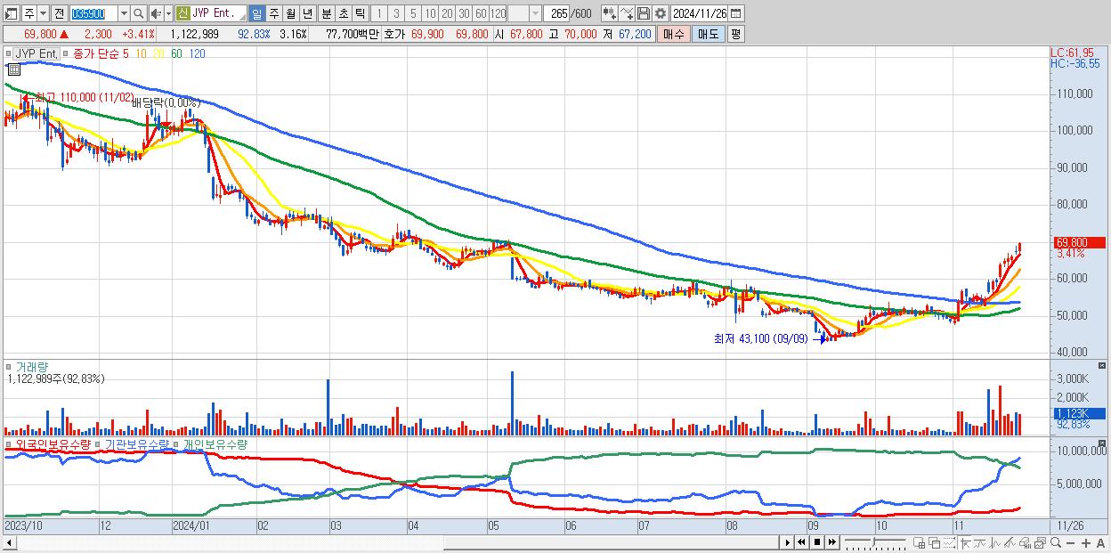 - JYP Ent. (69,800원 ▲ 3.41% , 시총: 24,802억, 외국인 순매수 거래금:146억)