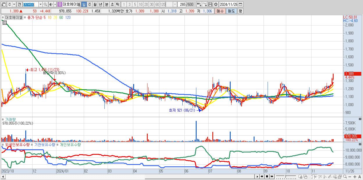 - 대호에이엘 (1,389원 ▲ 4.44% , 시총: 938억, 거래량: 978,055, 거래대금:13억, KOSPI)