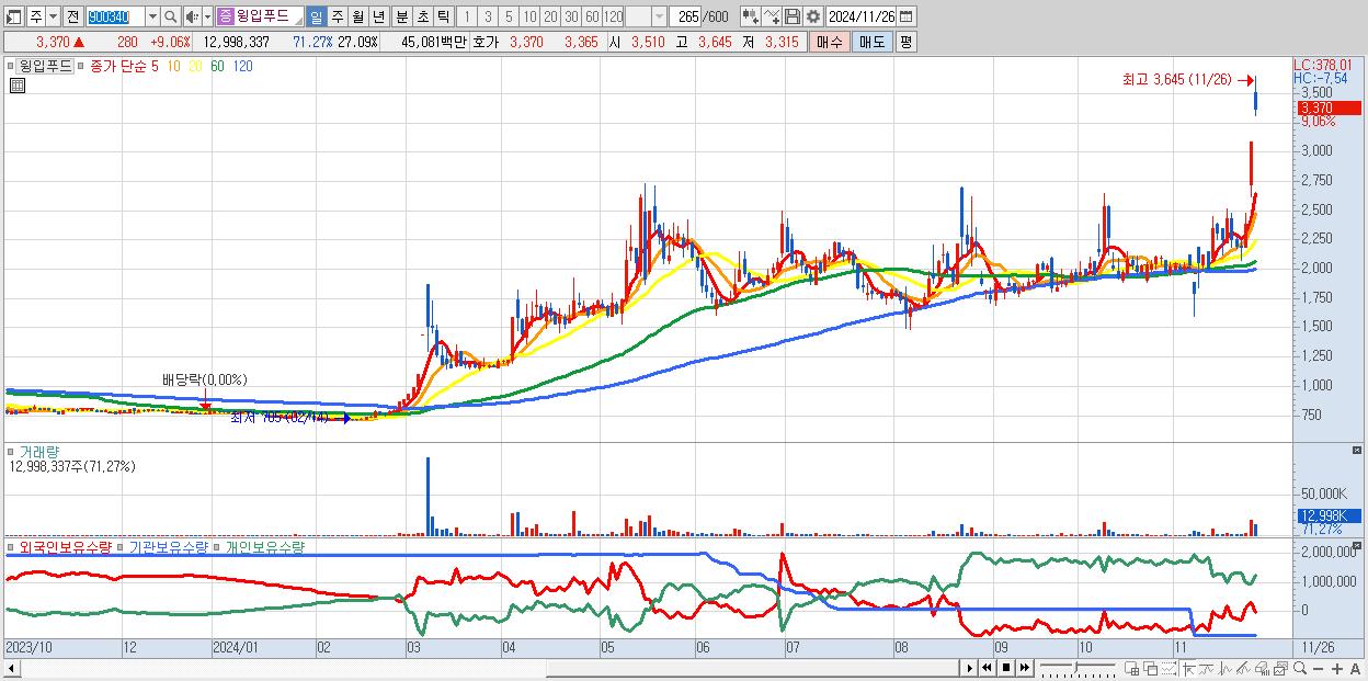 - 윙입푸드 (3,370원 ▲ 9.06% , 시총: 1,617억, 거래량: 12,998,337, 거래대금:451억, KOSDAQ)