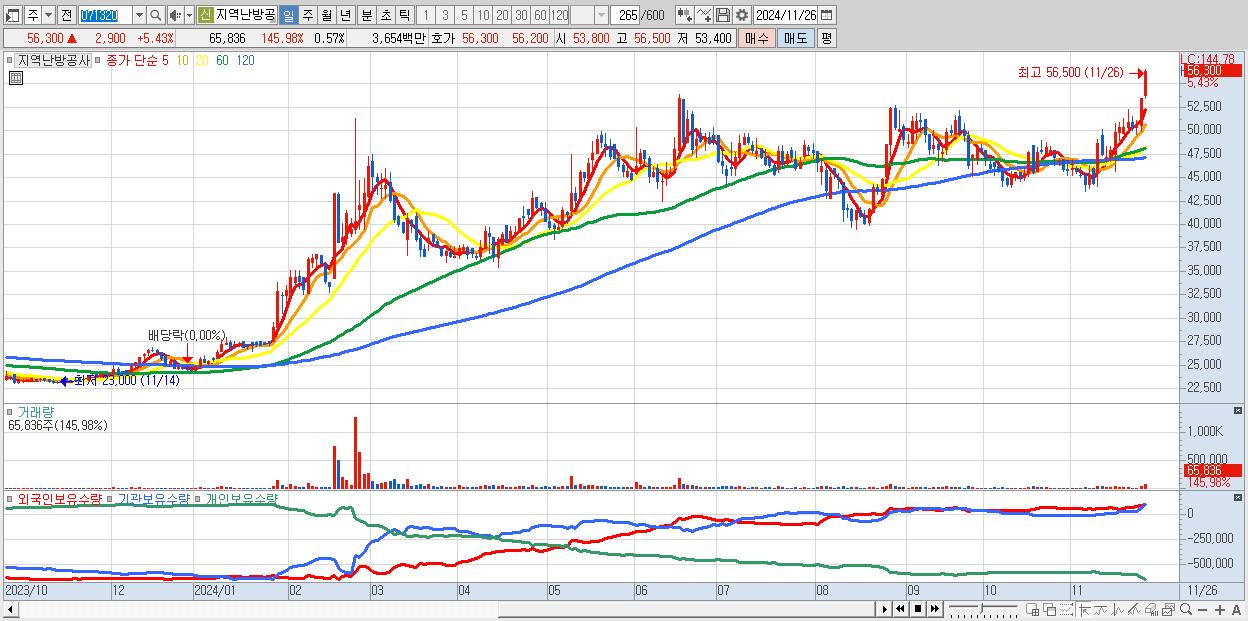 - 지역난방공사 (56,300원 ▲ 5.43% , 시총: 6,519억, 거래량: 65,836, 거래대금:37억, KOSPI)