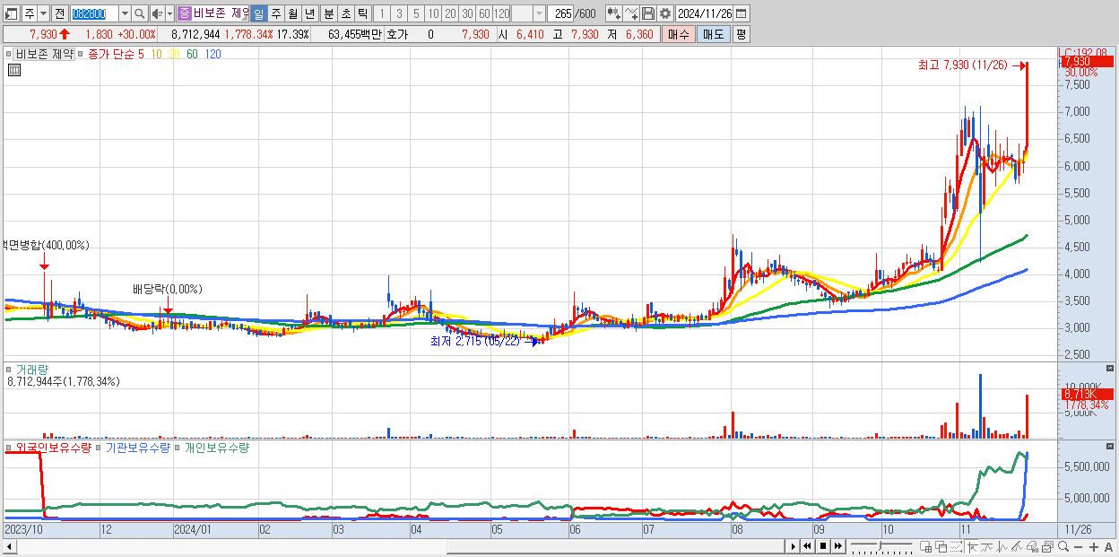 비보존 제약 7,930원 ▲ 30% (KOSDAQ, 082800)