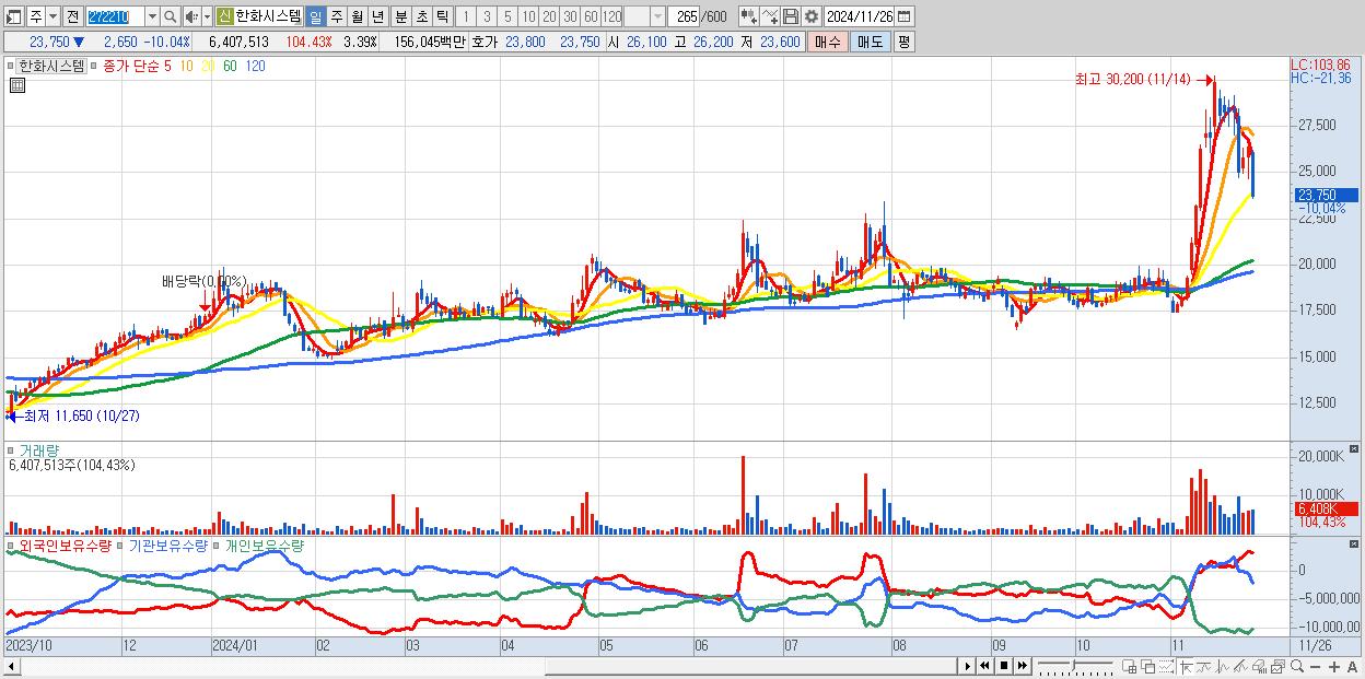 - 한화시스템 (23,750원 ▼ -10.04% , 시총: 44,868억, 거래량: 6,407,513, 거래대금:1,560억)