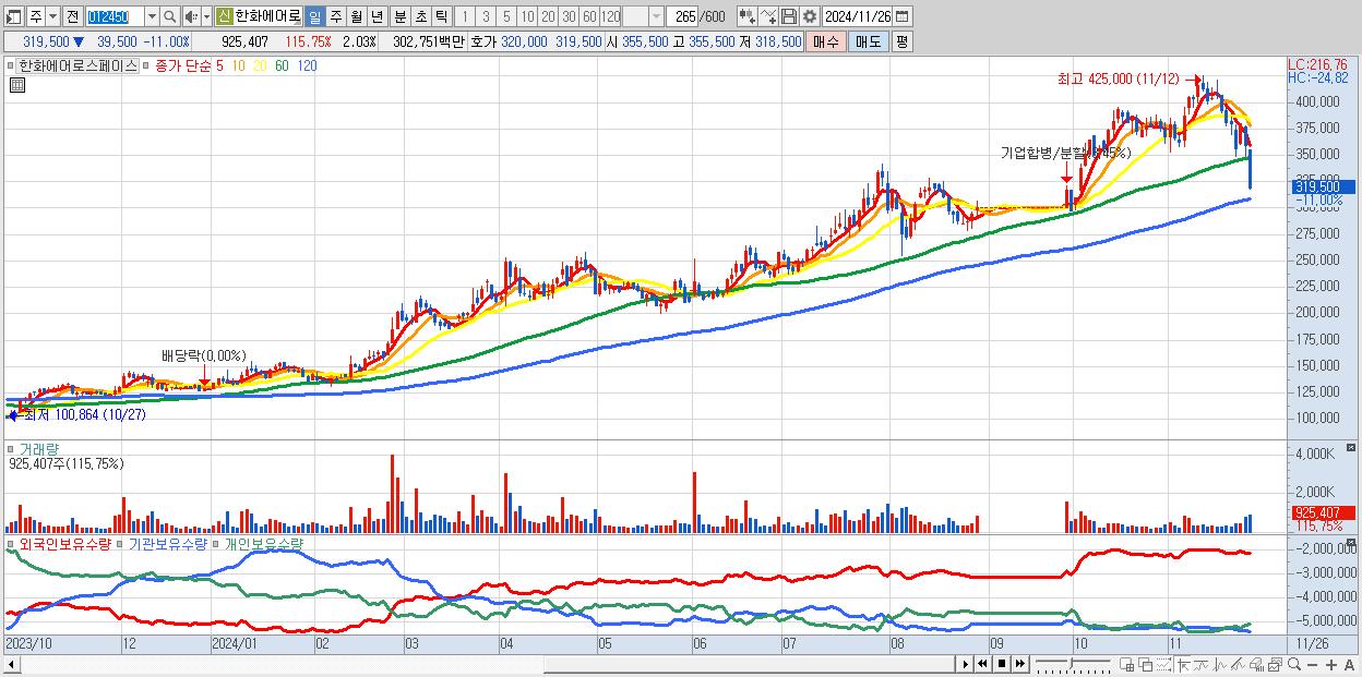 - 한화에어로스페이스 (319,500원 ▼ -11% , 시총: 145,632억, 거래량: 925,407, 거래대금:3,028억)
