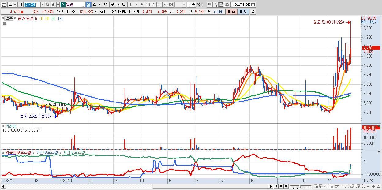 - 일승 (4,470원 ▲ 7.84% , 시총: 1,373억, 거래량: 18,910,038, 거래대금:872억)