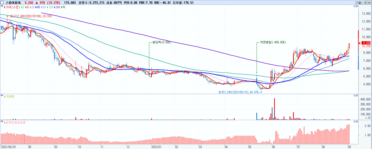 - 스피어파워 (9,260원 ▲ 10.37% , 시총: 868억, 거래량: 173,010, 거래대금:15억, KOSDAQ)