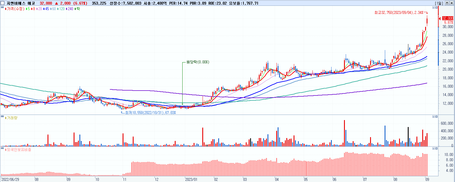 지앤비에스 에코 32,000원 ▲ 6.67% (KOSDAQ, 382800)