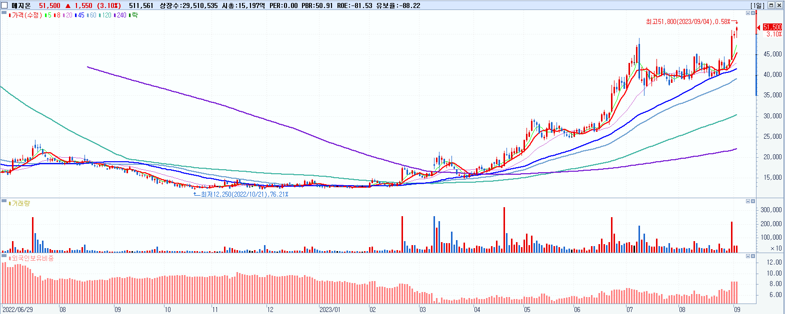 시총: 15,198억 거래량: 512,055 거래대금:261억