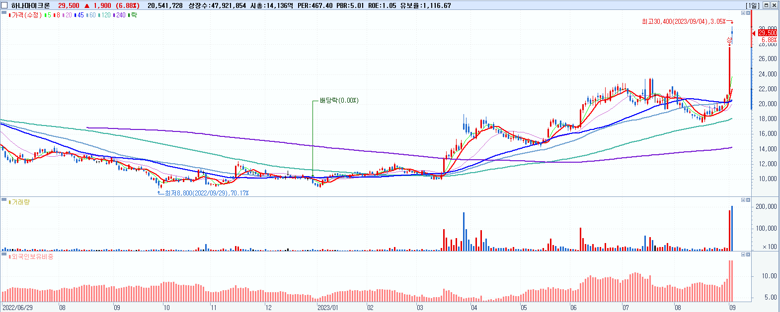 - 하나마이크론 (29,500원 ▲ 6.88% , 시총: 14,137억, 거래량: 20,549,993, 거래대금:6,029억, KOSDAQ)