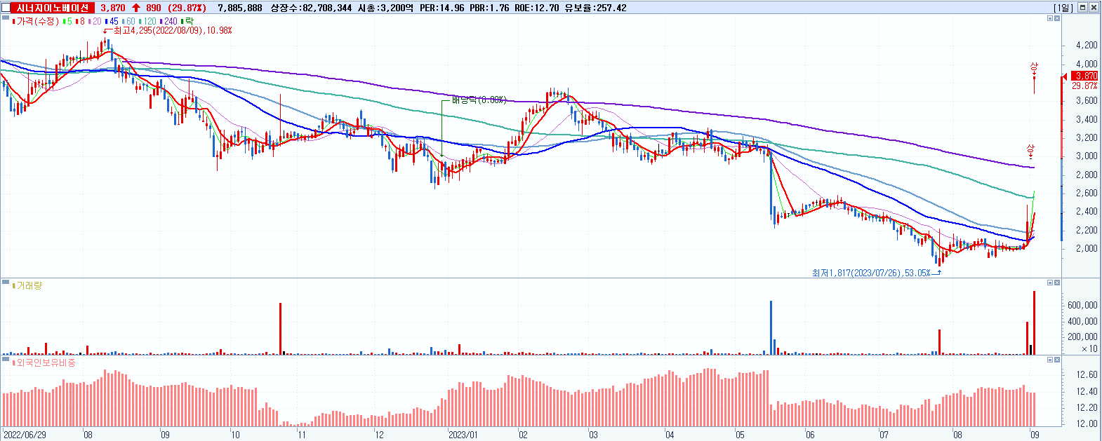 시너지이노베이션 3,870원 ▲ 29.87% (KOSDAQ, 048870)