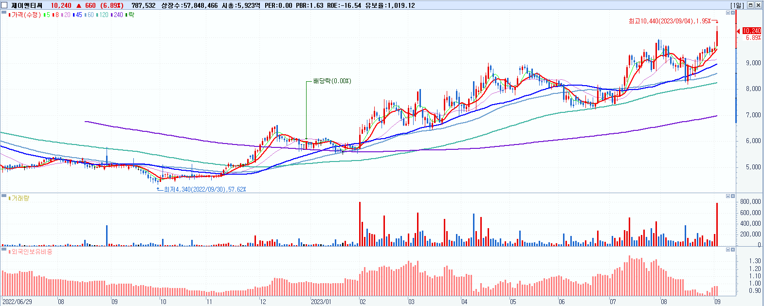 - 제이앤티씨 (10,240원 ▲ 6.89% , 시총: 5,924억, 거래량: 787,755, 거래대금:80억, KOSDAQ)