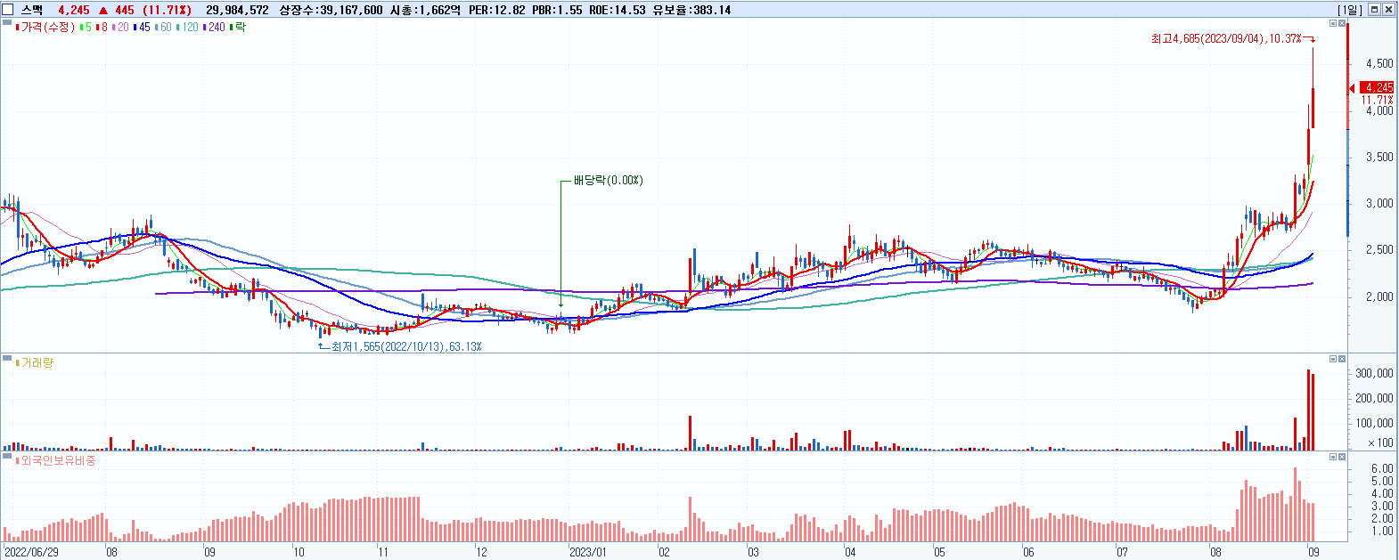 스맥 4,245원 ▲ 11.71% (KOSDAQ, 099440)