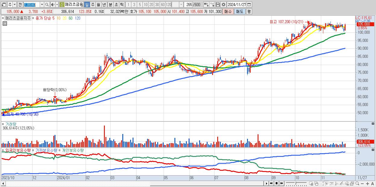 - 메리츠금융지주 (105,000원 ▲ 3.65% , 시총: 200,256억, 외국인 순매수 거래금:60억)