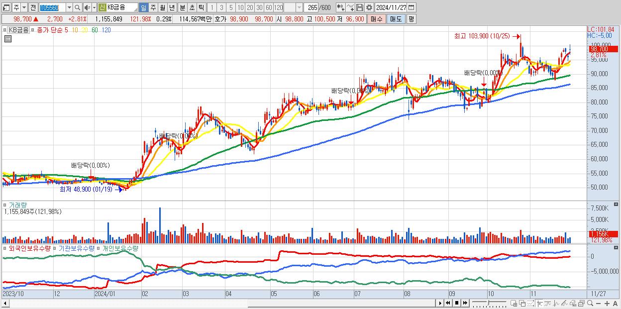 - KB금융 (98,700원 ▲ 2.81% , 시총: 388,413억, 외국인 순매수 거래금:95억)