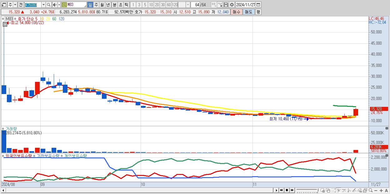 - M83 (15,320원 ▲ 24.76% , 시총: 1,193억, 거래량: 6,283,274, 거래대금:926억)