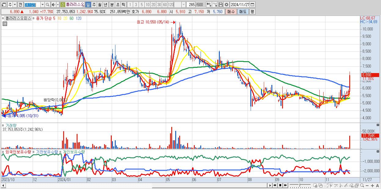 - 폴라리스오피스 (6,890원 ▲ 17.78% , 시총: 3,426억, 거래량: 37,753,853, 거래대금:2,519억)