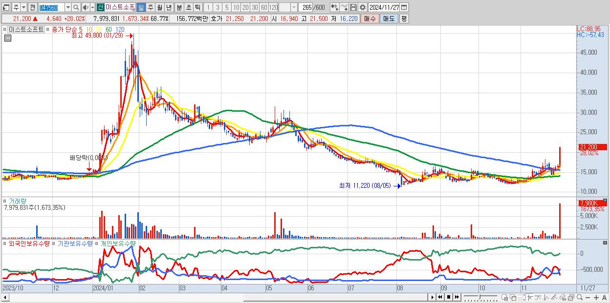 - 이스트소프트 (21,200원 ▲ 28.02% , 시총: 2,460억, 거래량: 7,979,831, 거래대금:1,568억)