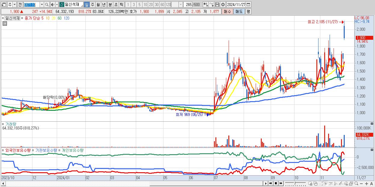 - 일신석재 (1,900원 ▲ 14.94% , 시총: 1,472억, 거래량: 64,332,193, 거래대금:1,262억)