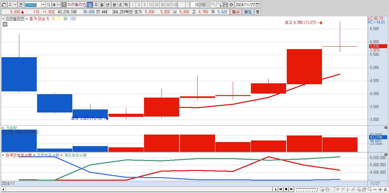 - 쓰리빌리언 (5,830원 ▲ 1.92% , 시총: 1,833억, 거래량: 43,218,108, 거래대금:2,643억)