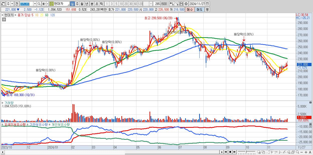 - 현대차 (221,000원 ▼ -1.12% , 시총: 462,810억, 거래량: 1,094,533, 거래대금:2,433억)