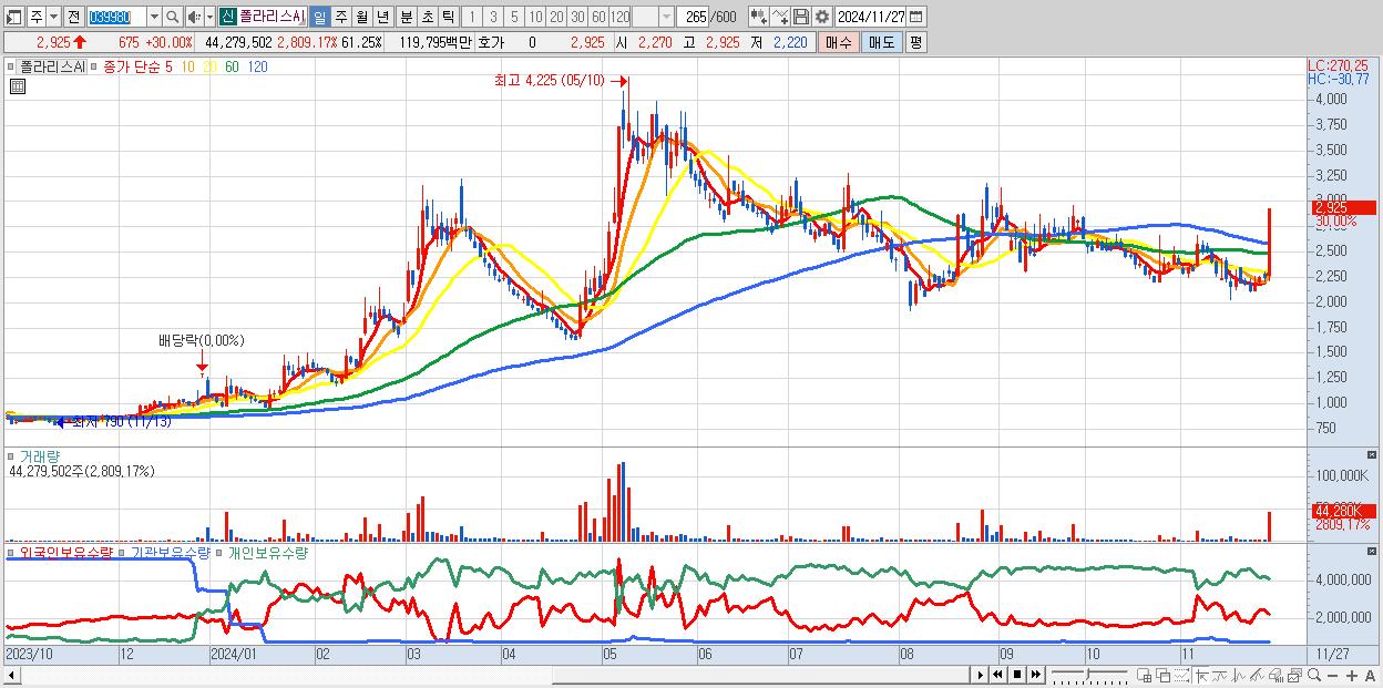 - 폴라리스AI (2,925원 ▲ 30% , 시총: 2,115억, 거래량: 44,279,502, 거래대금:1,198억)