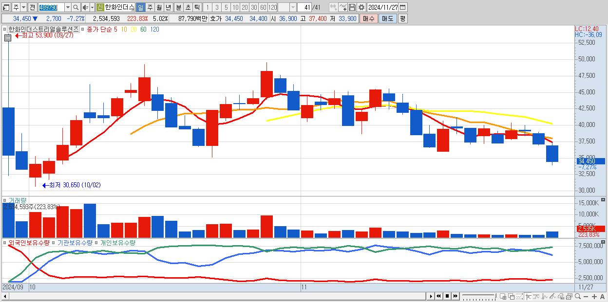 - 한화인더스트리얼솔루션즈 (34,450원 ▼ -7.27% , 시총: 17,393억, 거래량: 2,534,593, 거래대금:878억)