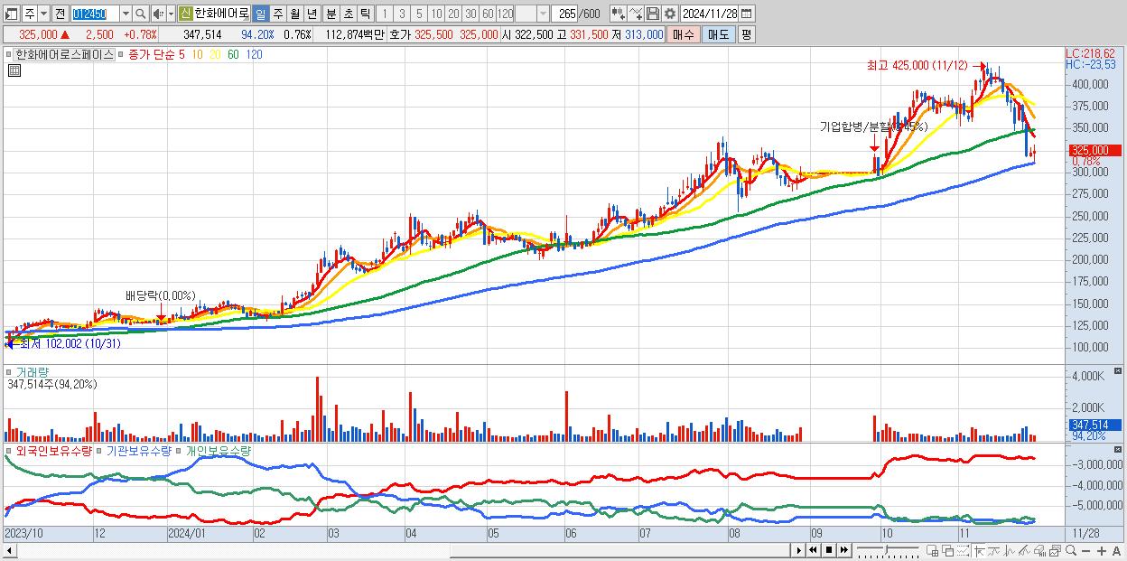 - 한화에어로스페이스 (325,000원 ▲ 0.78% , 시총: 148,139억, 거래량: 347,514, 거래대금:1,129억)