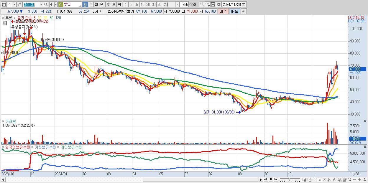 - 루닛 (67,000원 ▼ -4.29% , 시총: 19,392억, 거래량: 1,854,399, 거래대금:1,264억)