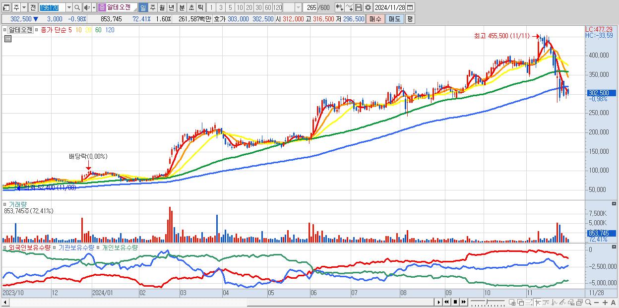 - 알테오젠 (302,500원 ▼ -0.98% , 시총: 161,289억, 거래량: 853,745, 거래대금:2,616억)
