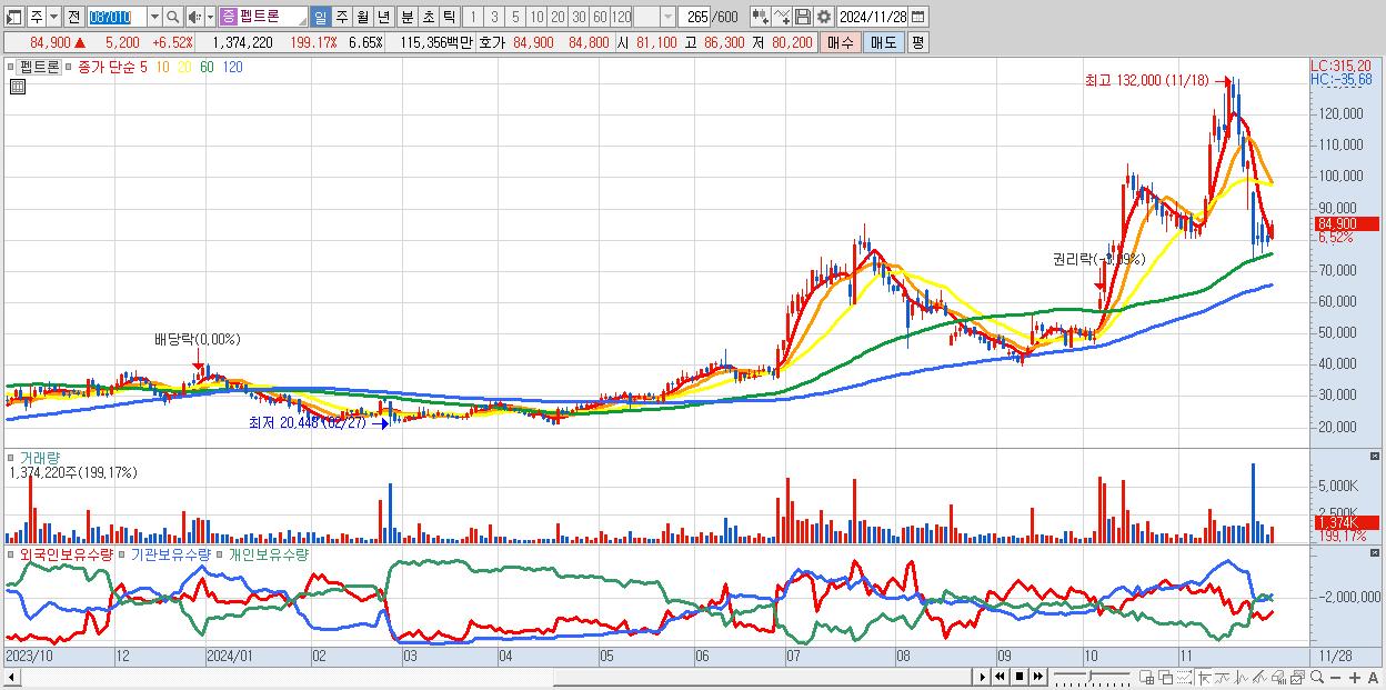 - 펩트론 (84,900원 ▲ 6.52% , 시총: 17,538억, 거래량: 1,374,220, 거래대금:1,154억)