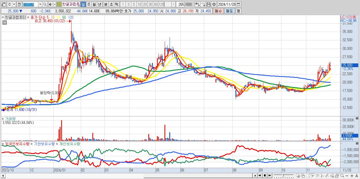 - 한글과컴퓨터 (25,000원 ▼ -2.34% , 시총: 6,045억, 거래량: 3,550,322, 거래대금:899억)