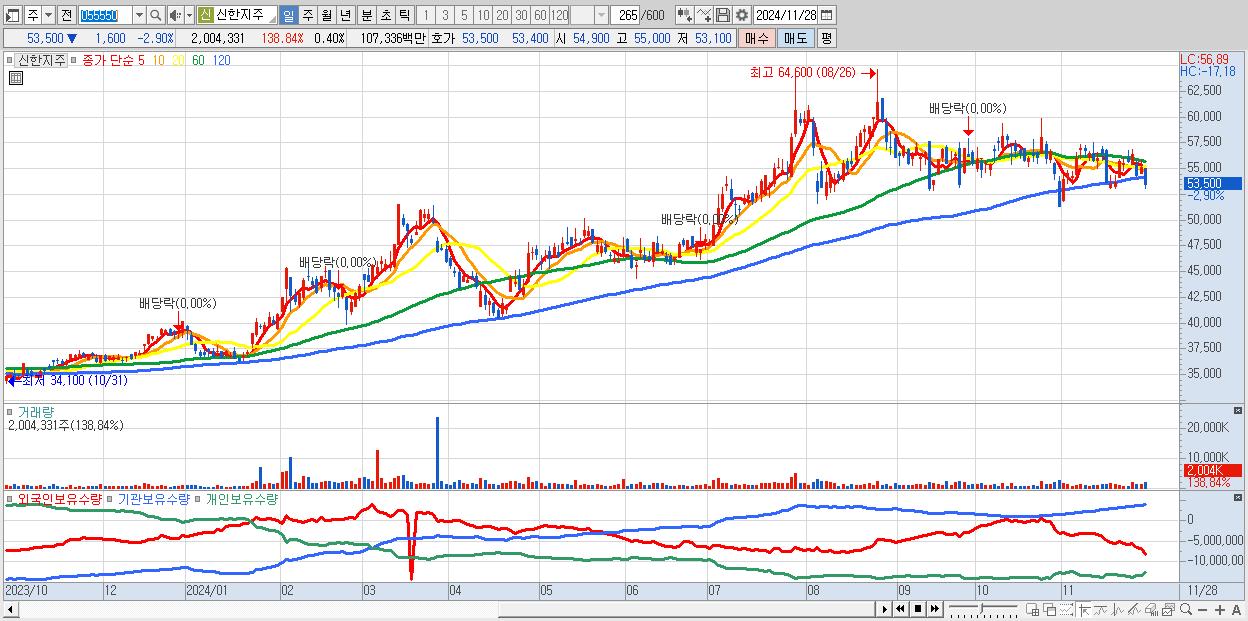 - 신한지주 (53,500원 ▼ -2.9% , 시총: 269,343억, 거래량: 2,004,331, 거래대금:1,073억)