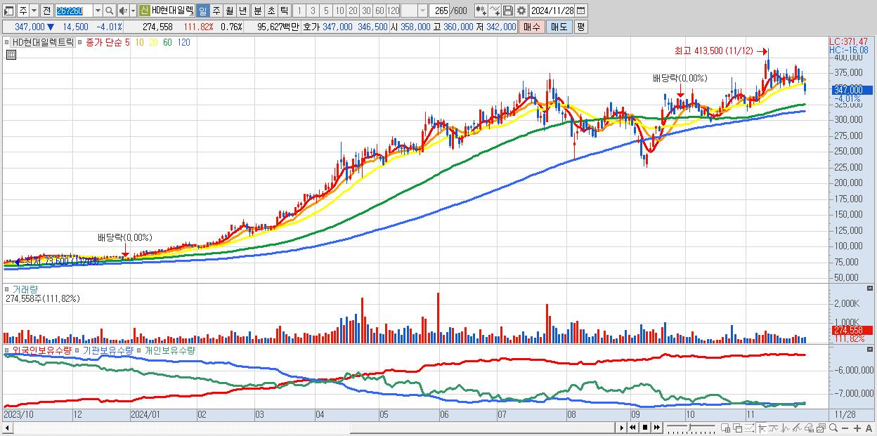 - HD현대일렉트릭 (347,000원 ▼ -4.01% , 시총: 125,084억, 거래량: 274,558, 거래대금:956억)