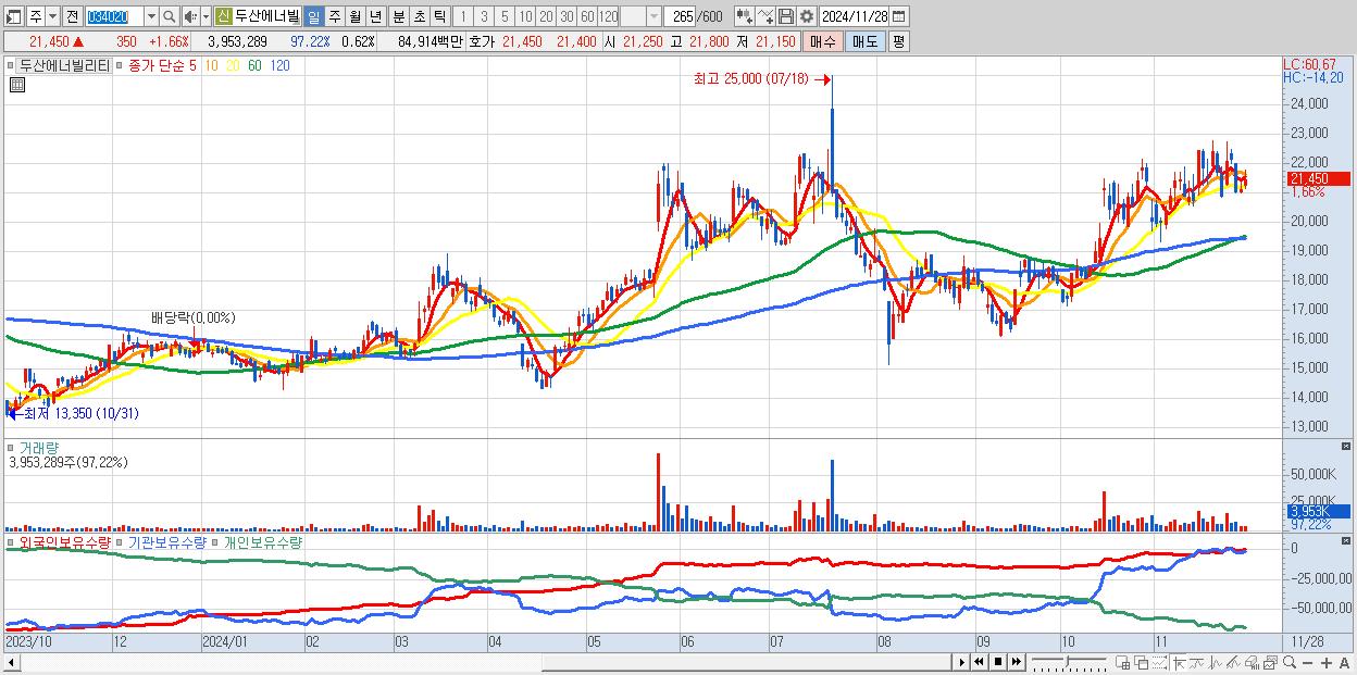 - 두산에너빌리티 (21,450원 ▲ 1.66% , 시총: 137,400억, 거래량: 3,953,289, 거래대금:849억)