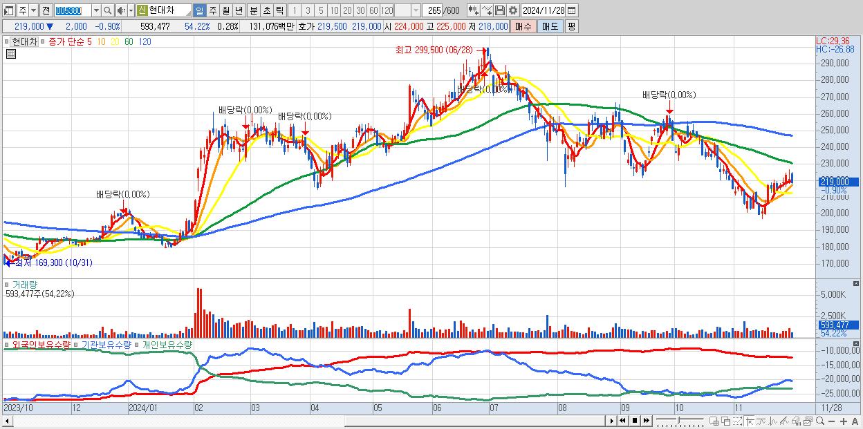- 현대차 (219,000원 ▼ -0.9% , 시총: 458,621억, 거래량: 593,477, 거래대금:1,311억)