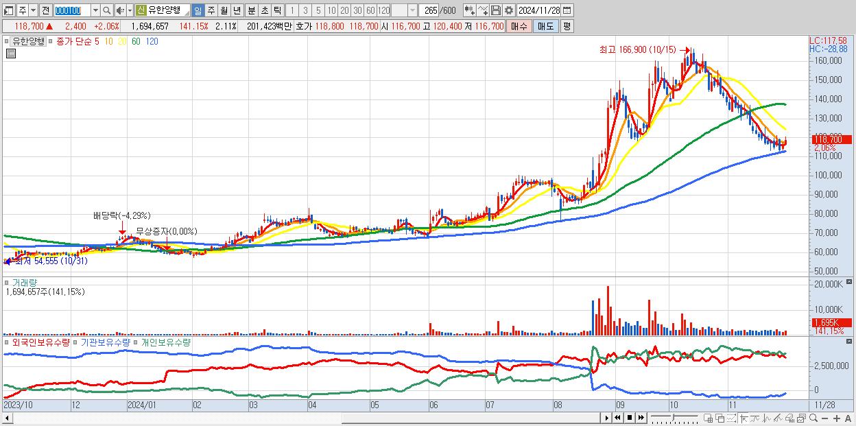 - 유한양행 (118,700원 ▲ 2.06% , 시총: 95,208억, 거래량: 1,694,657, 거래대금:2,014억)